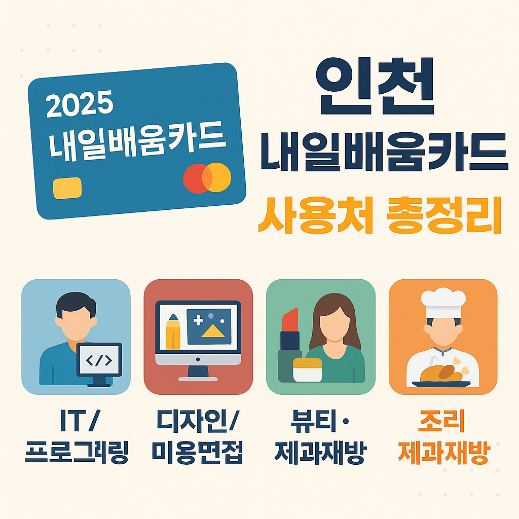 2025년 기준 내일배움카드는 취업 준비생, 재직자, 자영업자까지 누구나 활용할 수 있는 국가 지원 직업훈련 카드입니다. 인천 지역에서는 IT, 디자인, 요리, 뷰티, 회계, 외국어 등 다양한 교육기관에서 사용 가능합니다.