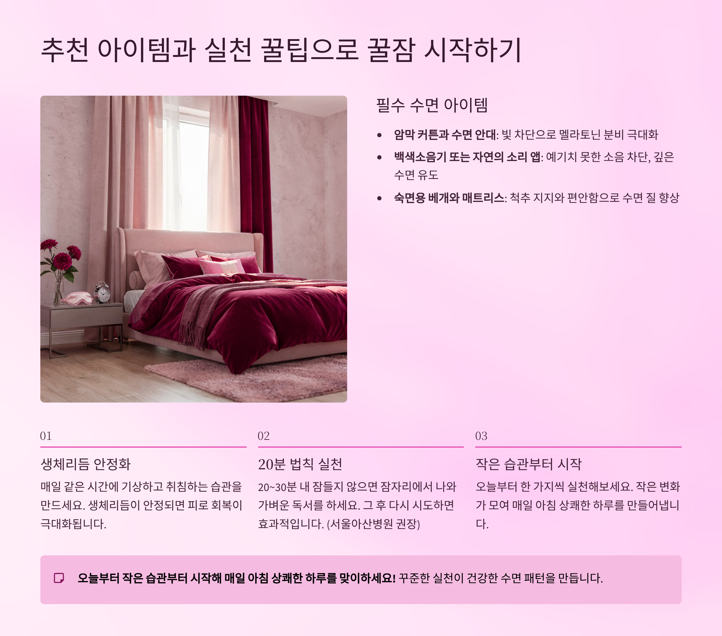 오늘부터 수면 습관 하나만 바꿔도 삶의 질이 달라집니다. 지금 내 방을 점검해보세요!
