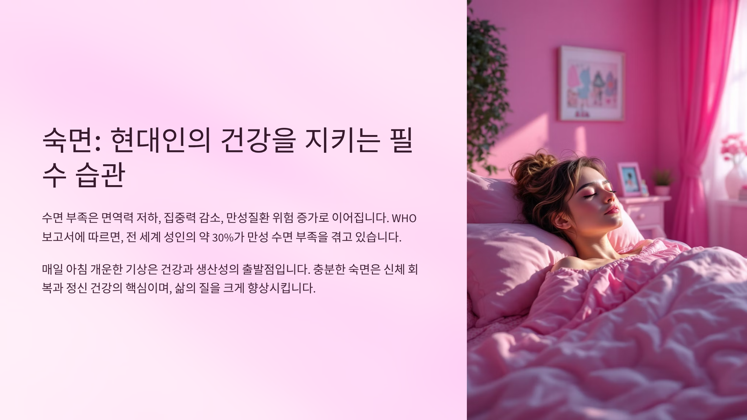 수면은 건강의 기본입니다. 숙면 환경을 개선하고, 수면 리듬을 지키는 것만으로도 면역력과 정신 건강을 지킬 수 있습니다. 오늘부터 '수면'에 투자해보세요.