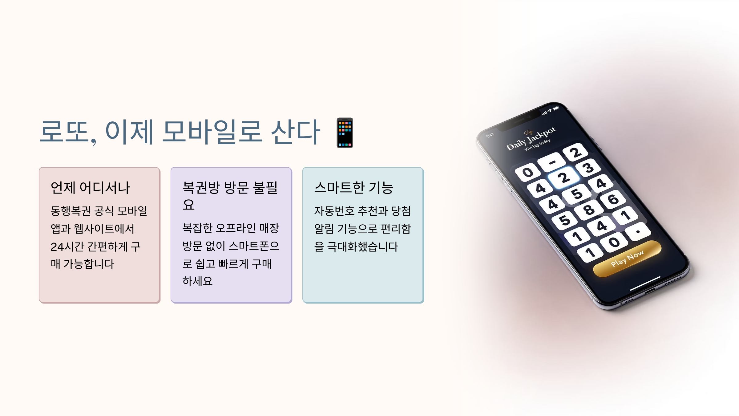 이제는 스마트폰 하나로 언제 어디서든 로또 구매가 가능합니다.