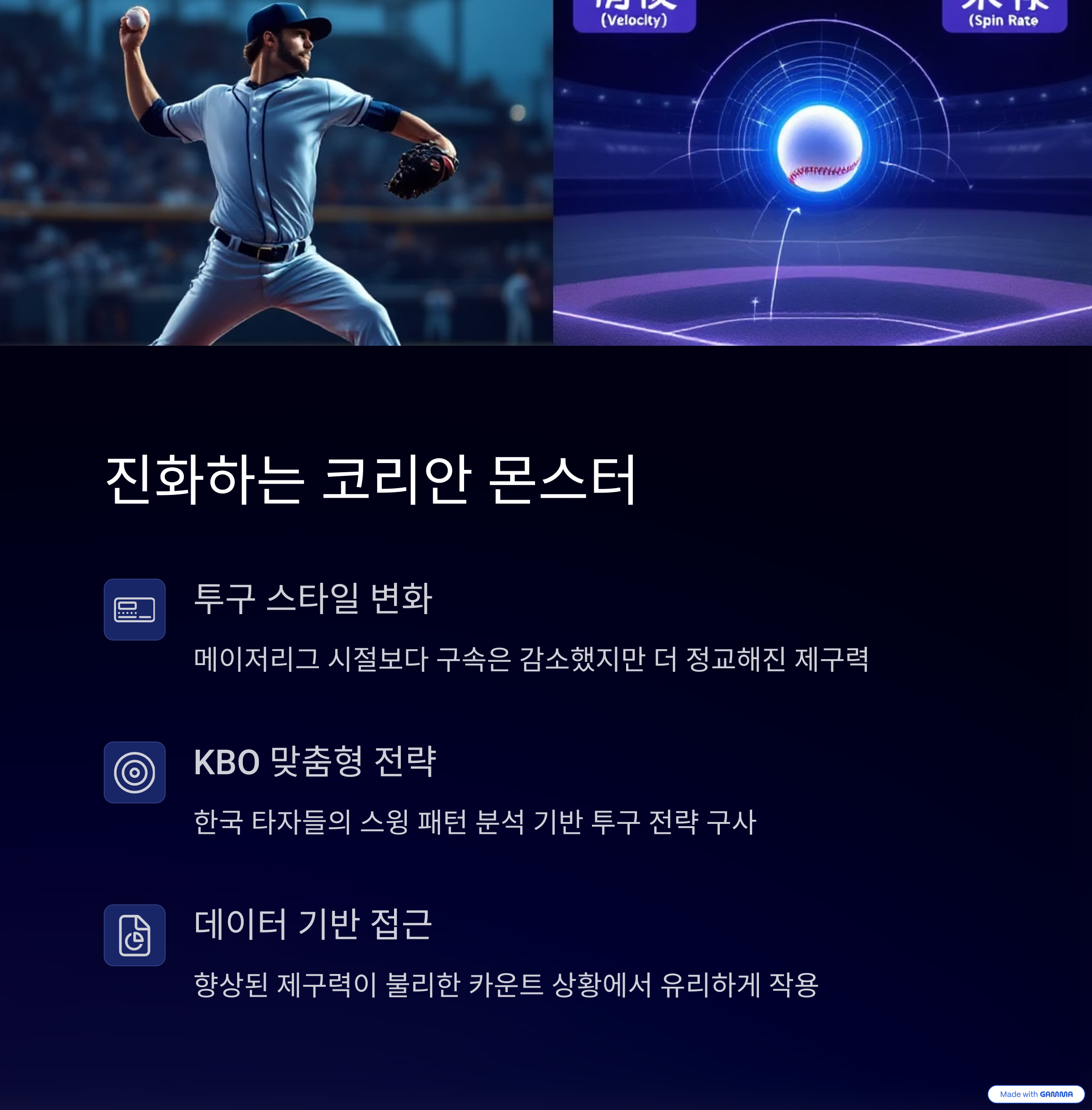 과거 MLB 시절 평균 구속이 약 93-94mph였던 반면, KBO에서의 속도는 약 91.5mph로 약간 낮아졌지만 정교한 제구력은 개선되었습니다.