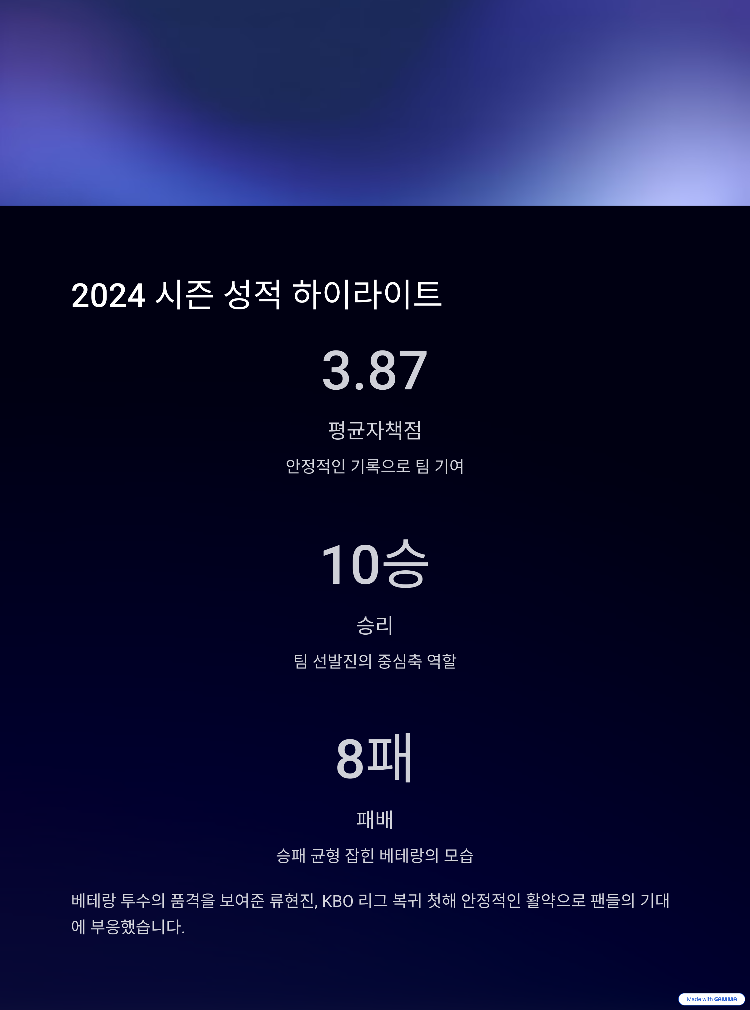 | 2024 시즌 주요 기록 | 10승 8패, 평균자책점 3.87 |