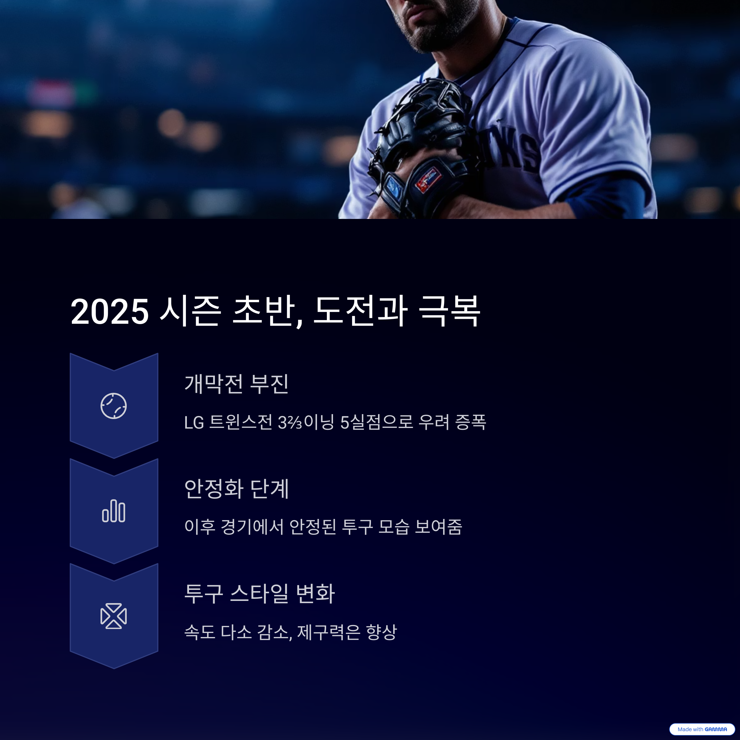2025 시즌 개막전, LG 트윈스와의 첫 경기에서 그는 3과 3분의 2이닝 동안 5실점(2자책)을 기록했으나 이는 투구 수의 조절 부족으로부터 비롯된 것이라는 해석이 많습니다.
