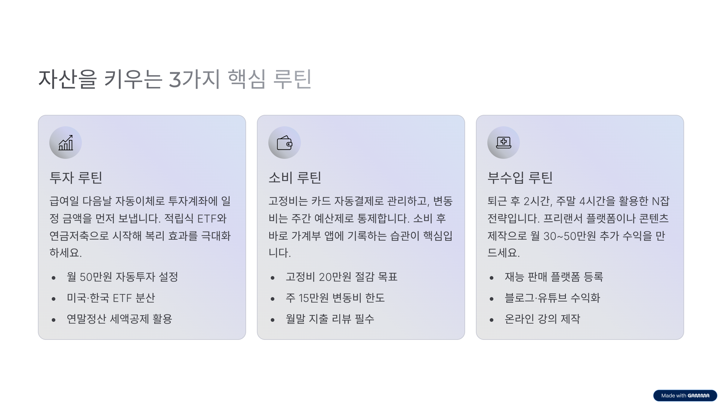사례: 직장인 김모 씨(32세)는 월세 60만 원을 내며 월 200만 원 급여 중 40만 원을 ETF 자동 투자로 전환했습니다.