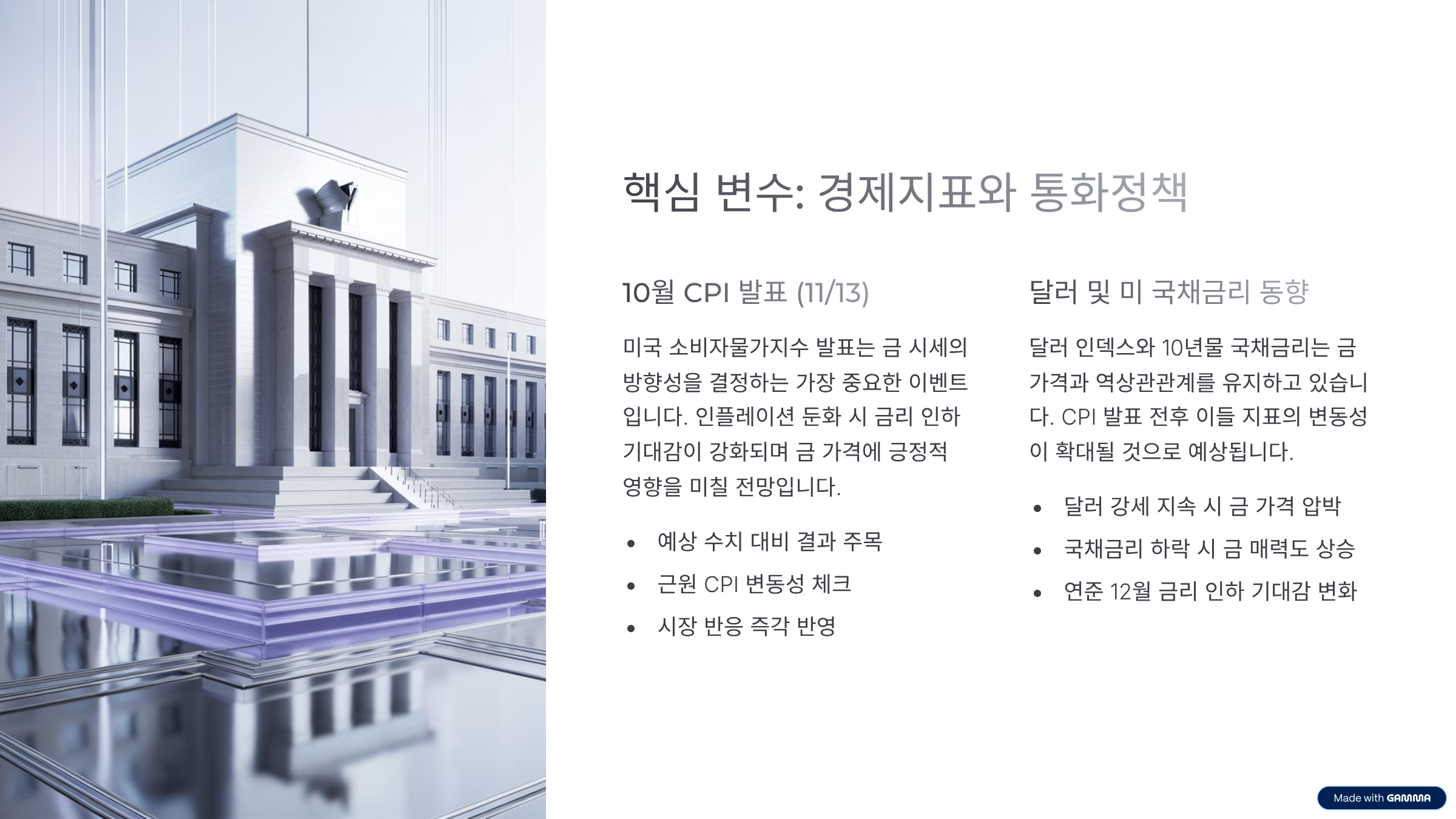 요약하면, 이번 주 금 시세는 10월 CPI 발표(현지 11월 13일 예정) 전후로 달러·금리와 함께 커다란 분기점을 맞이할 수 있습니다. 이벤트 전후 변동성을 전제로 시나리오별 계획을 세우고, 지지/저항·모멘텀 신호를 함께 확인하세요. 장기 관점에서는 분할·분산·리밸런싱 원칙을 유지하는 것이 바람직합니다.