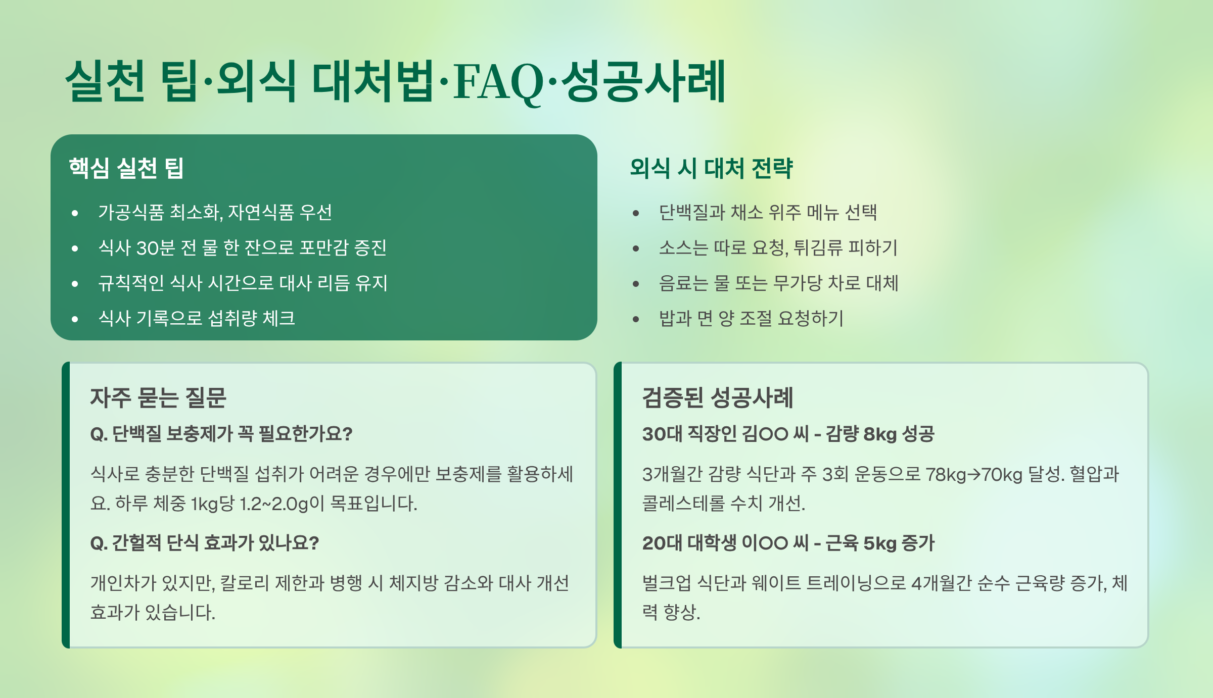 - 외식 메뉴도 현명하게: 드레싱 제외, 찜·구이 선택, 반찬 절반만 섭취 등 전략 필요