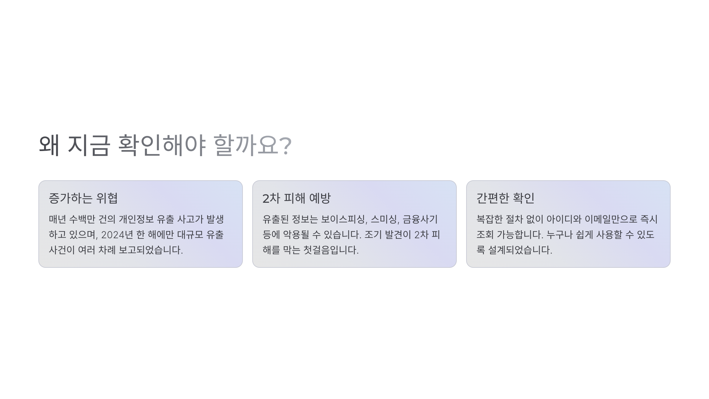 유출 여부는 아이디 또는 이메일 주소만으로도 확인이 가능하며, 계좌번호나 주민번호 등 민감한 정보를 입력하지 않아도 됩니다.