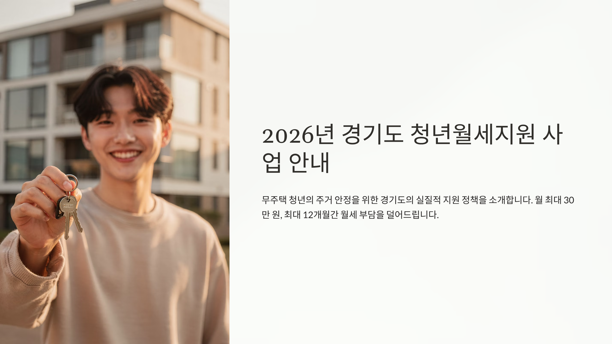 2026년 경기도는 청년층의 주거 부담을 덜기 위해 '청년 월세지원 제도'를 운영합니다. 월세를 내고 있는 무주택 청년에게 최대 월 30만 원까지, 총 12개월간 지원금을 지급하는 정책입니다. 이 제도는 경제적 여건이 어려운 청년들의 독립과 자립을 돕기 위해 마련되었습니다.