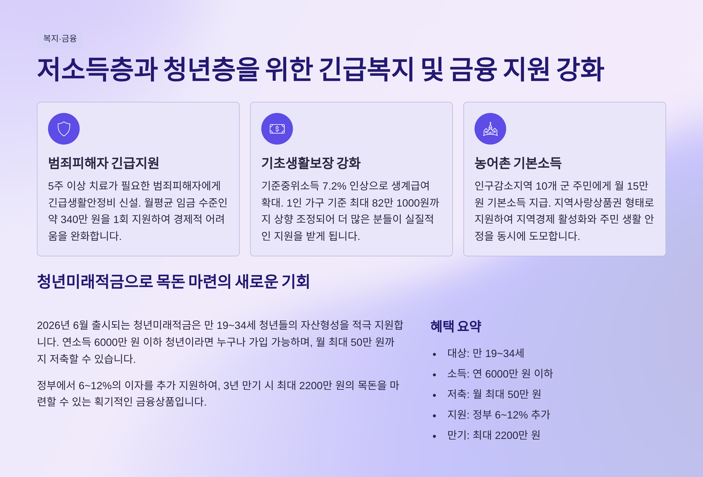 복지 분야에서는 저소득 가구와 청년층을 위한 지원 확대가 눈에 띕니다. 2026년부터는 긴급복지 지원금 상한이 상향되고, 에너지바우처 지급 대상이 늘어납니다. 또한, 청년을 위한 전세자금 지원 한도가 상향 조정됩니다.