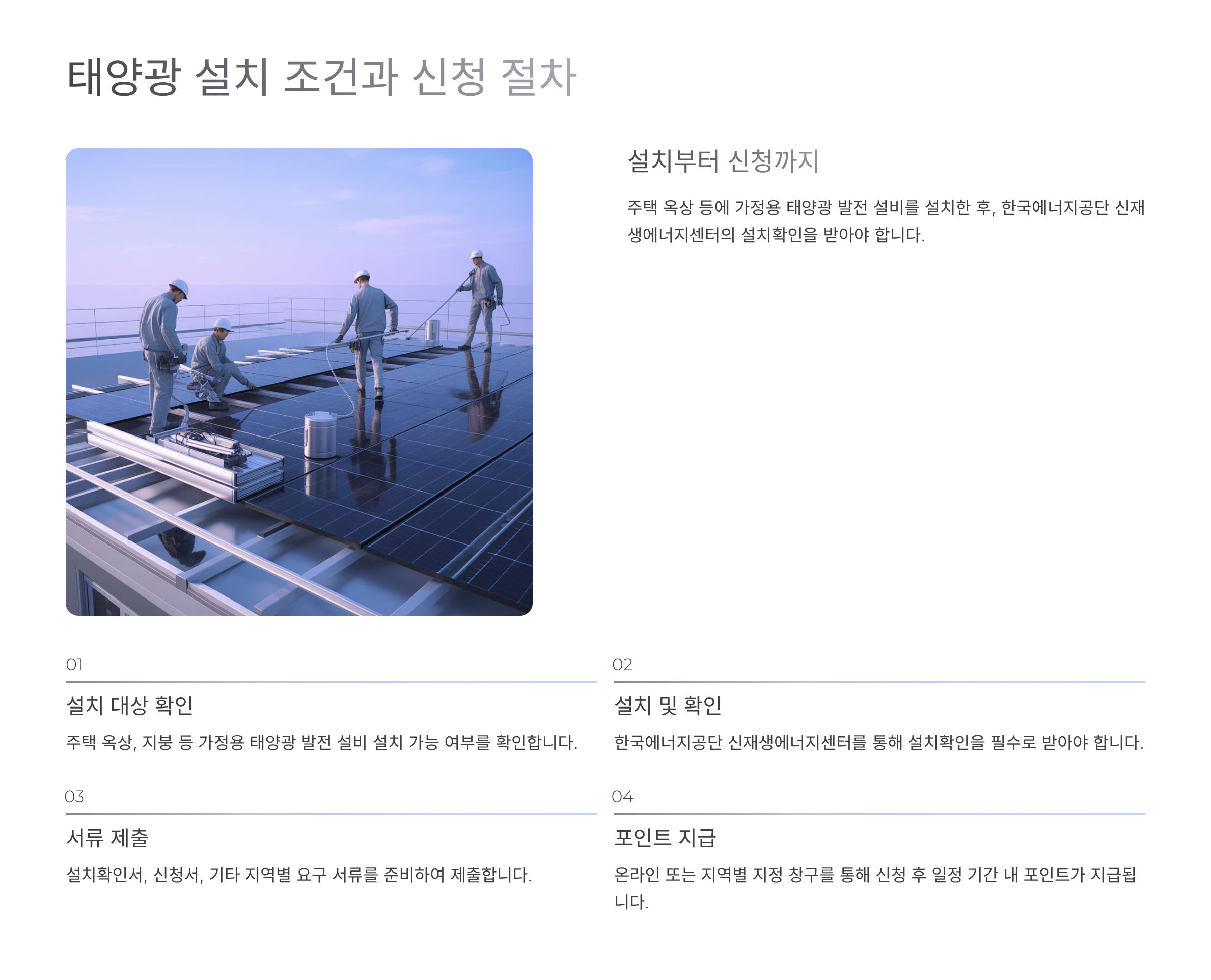 탄소중립포인트의 태양광 설치 인센티브는 아래 조건을 충족한 경우 지급됩니다.