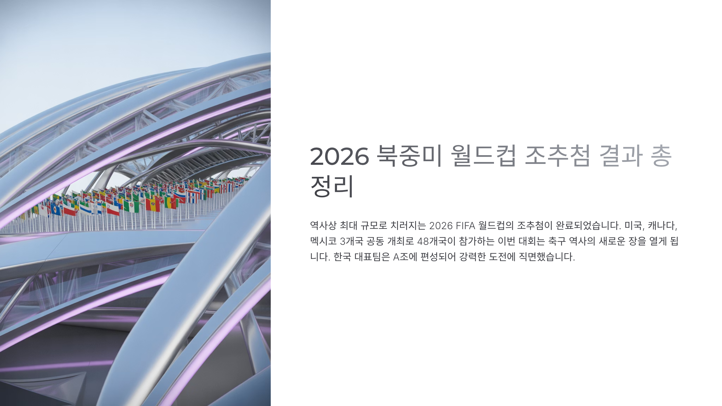 2026년 6월 개막하는 2026 FIFA 북중미 월드컵의 조추첨이 완료되었습니다. 이번 대회는 사상 최초 48개국 참가, 12개 조 구성, 각 조 1~2위 + 3위 중 상위 8팀이 32강 진출 방식으로 진행됩니다. 한국 축구대표팀은 A조에 배정되어 개최국 멕시코, 남아프리카공화국, 그리고 유럽 플레이오프 승자와 함께 경쟁하게 되었습니다.