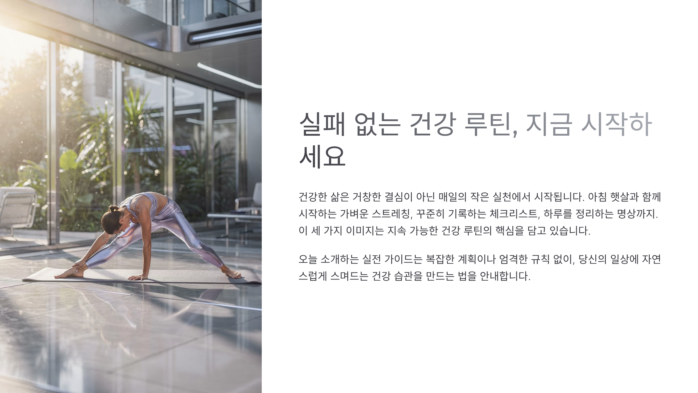 건강 루틴은 한순간의 노력으로 완성되지 않습니다. 작고 실천 가능한 목표를 정하고 꾸준히 이어가는 것이 가장 중요합니다. 지금 이 순간, 작게라도 시작해보세요. 변화는 생각보다 가까운 곳에서 시작됩니다.